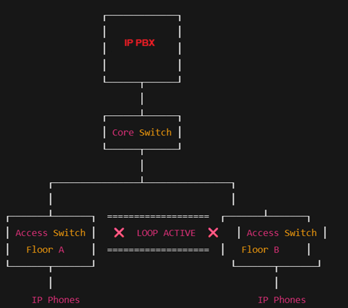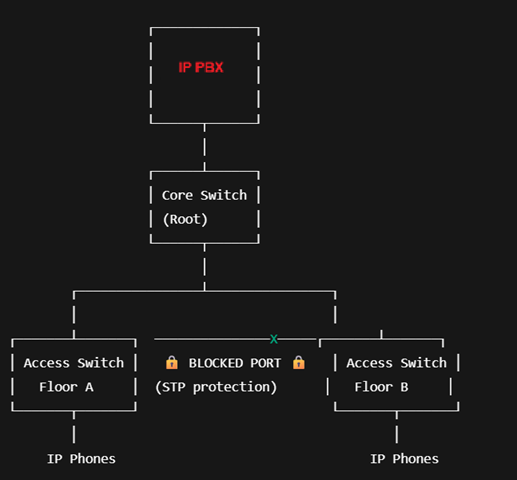 Below is a clear BEFORE / AFTER diagram showing how STP (Spanning Tree Protocol) stops a VoIP broadcast storm